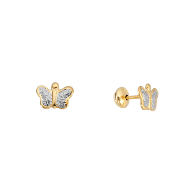 Cada par de aretes presenta una mariposa estilizada, cuidadosamente elaborada con un laminado de oro de 18 quilates, que brilla con un resplandor dorado celestial. Las líneas suaves y fluidas de las alas reflejan la gracia y la belleza en vuelo de estos seres alados.